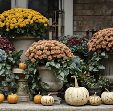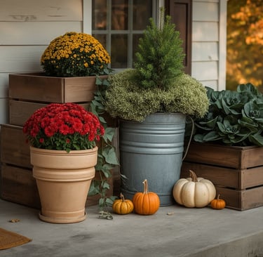For a classic fall look, start with rustic containers like weathered wood boxes, galvanized buckets, or clay pots. Their natural textures pair beautifully with autumn colors and make any arrangement feel warm and welcoming. Fill them with a mix of mums, ornamental kale, trailing ivy, and small pumpkins to create a full, inviting display that feels both seasonal and organic.