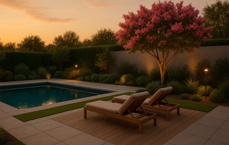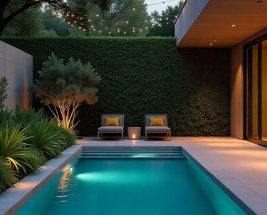 Cozy poolside lounge at sunset with warm lighting, sleek loungers, and lush garden accents.