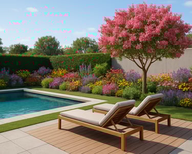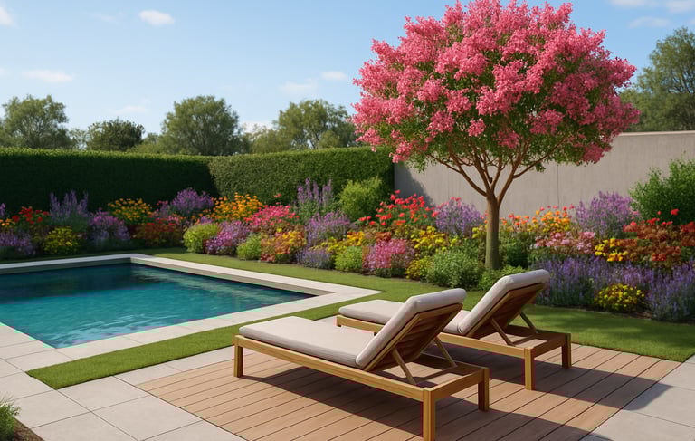 Bright, modern pool deck framed by vibrant flowering borders and clean-lined teak loungers.