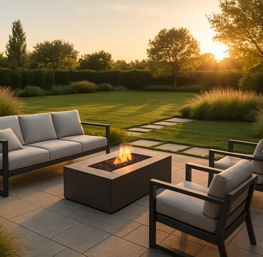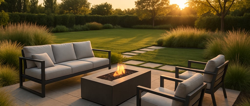 A modern outdoor retreat featuring clean-lined furniture, lush ornamental grasses, and a sleek fire feature — the perfect balance of structure and softness for timeless garden style.